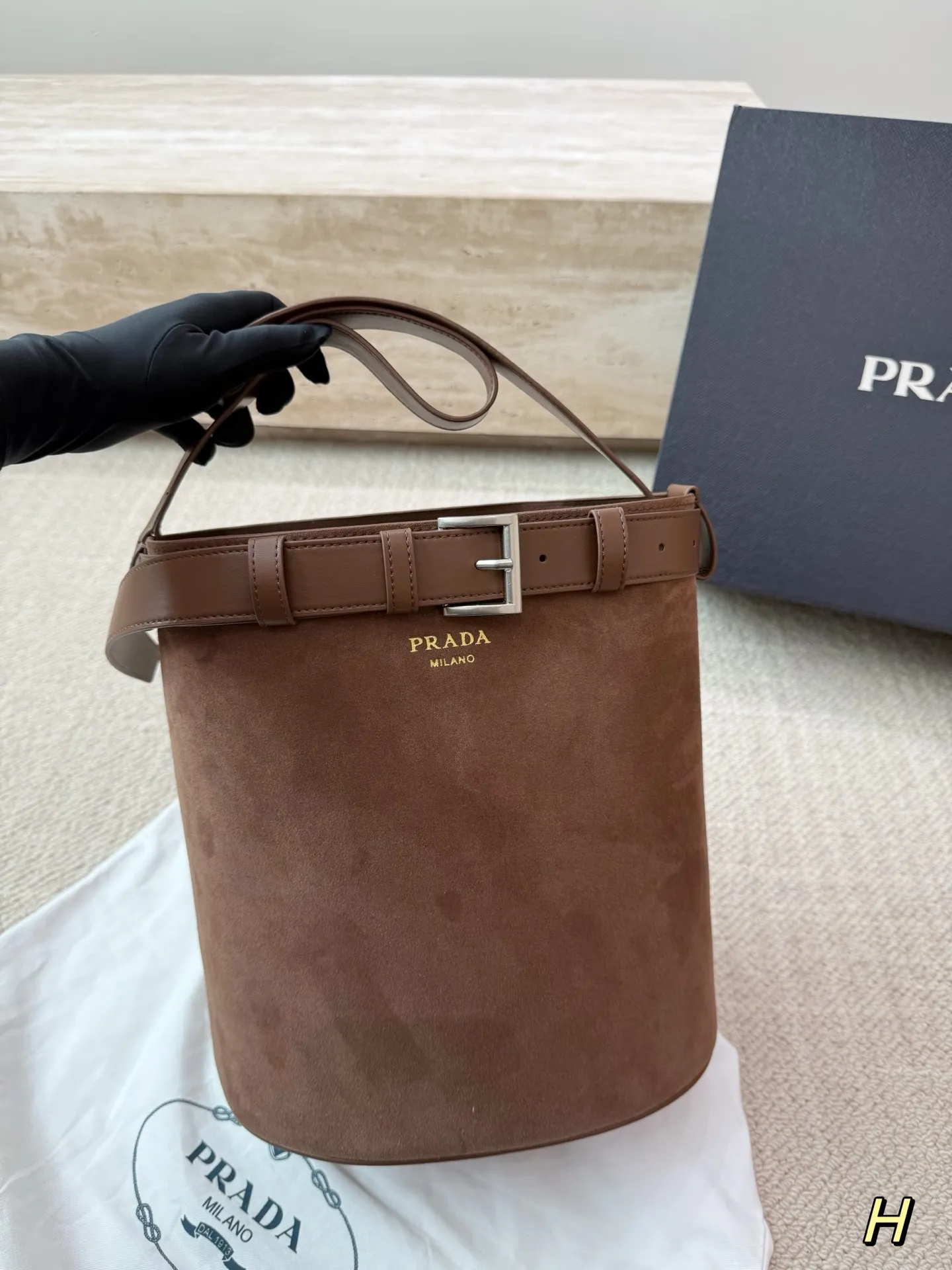 PRADA bucket bag, suede, SIZE: 28.26